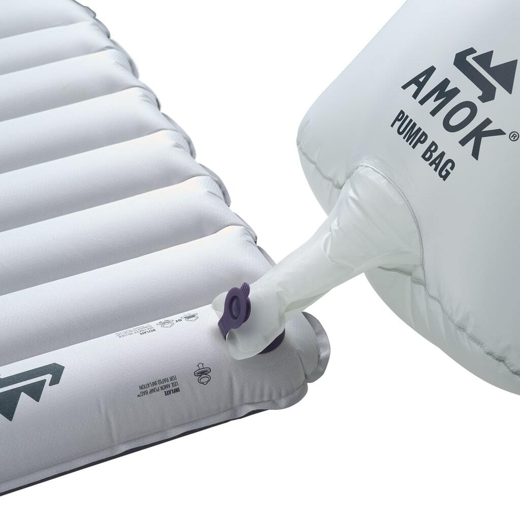 Pumpeposen festes i ventilen og brukes for å blåse opp underlaget. Åpne posen og fyll den med luft, deretter bretter du inn kantene og klemmer posen sammen slik at luften går gjennom ventilen og inn i underlaget. Dersom det er litt vind kan du enkelt "fange" luft ved å holde pumpeposen med åpningen mot vindretningen. Dersom det er vindstille kan du blåse inn i pumpeposen fra litt avstand, dette hjelper omkringliggende luft inn i posen.