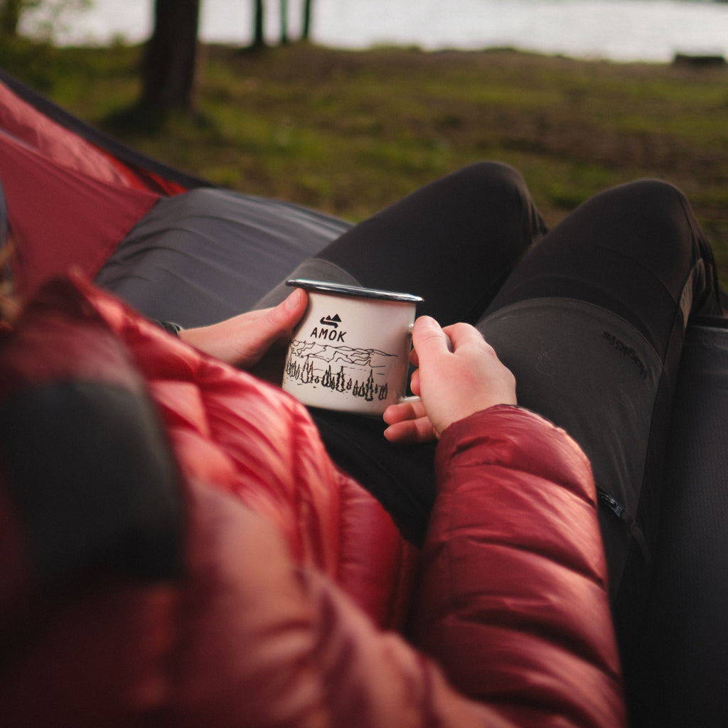 Hengekøyekoppen er laget av slitesterkt emaljebelagt stål og er konstruert for å tåle utfordringene ved utendørs bruk. Ikke bare rommer det 4 dl av favorittdrikken din, kruset er også et praktisk verktøy for å kalibrere hengekøyen til den perfekte 30°-hellingen.