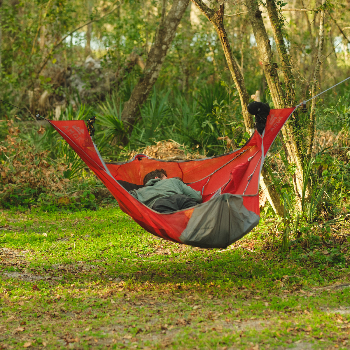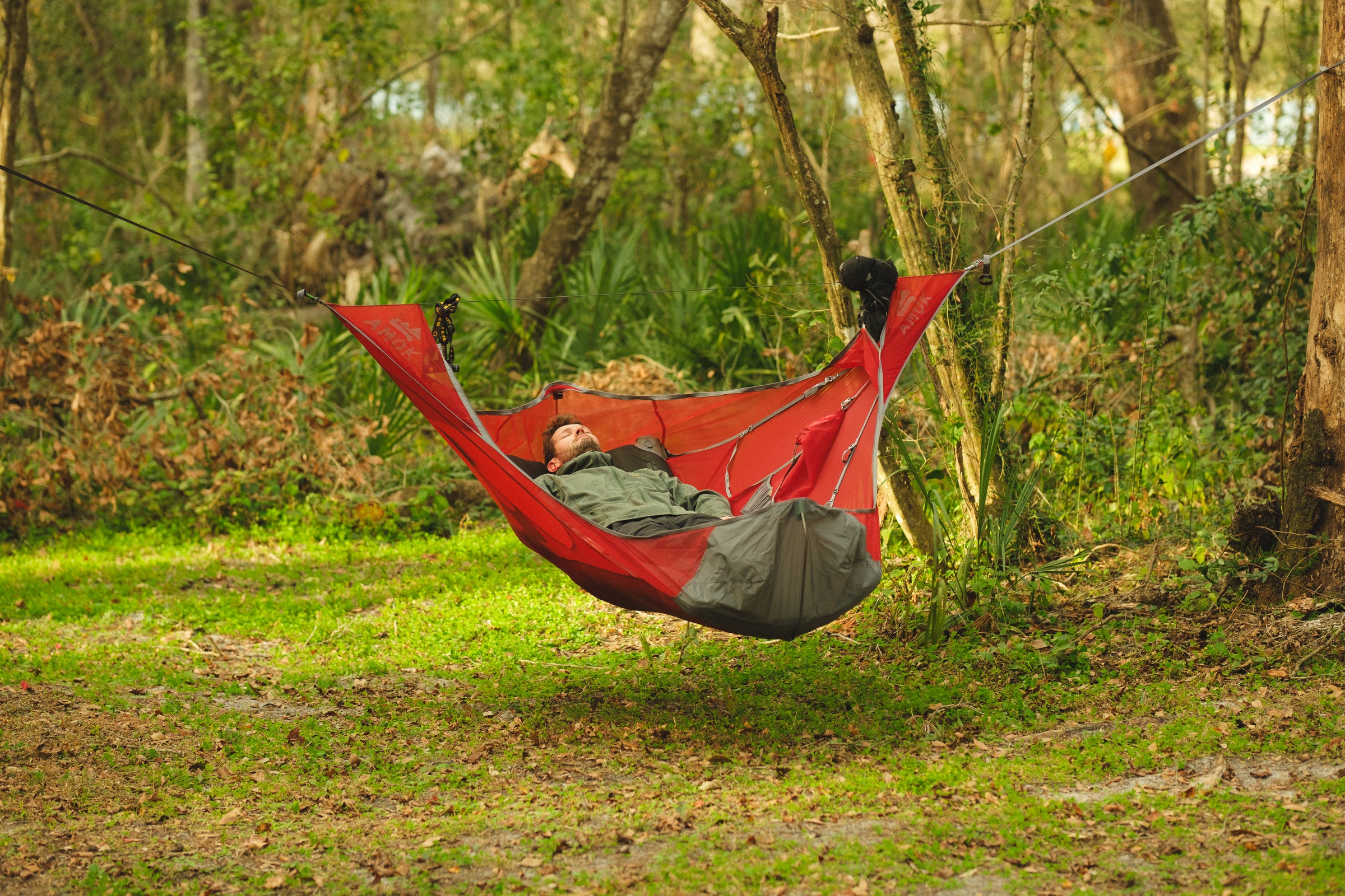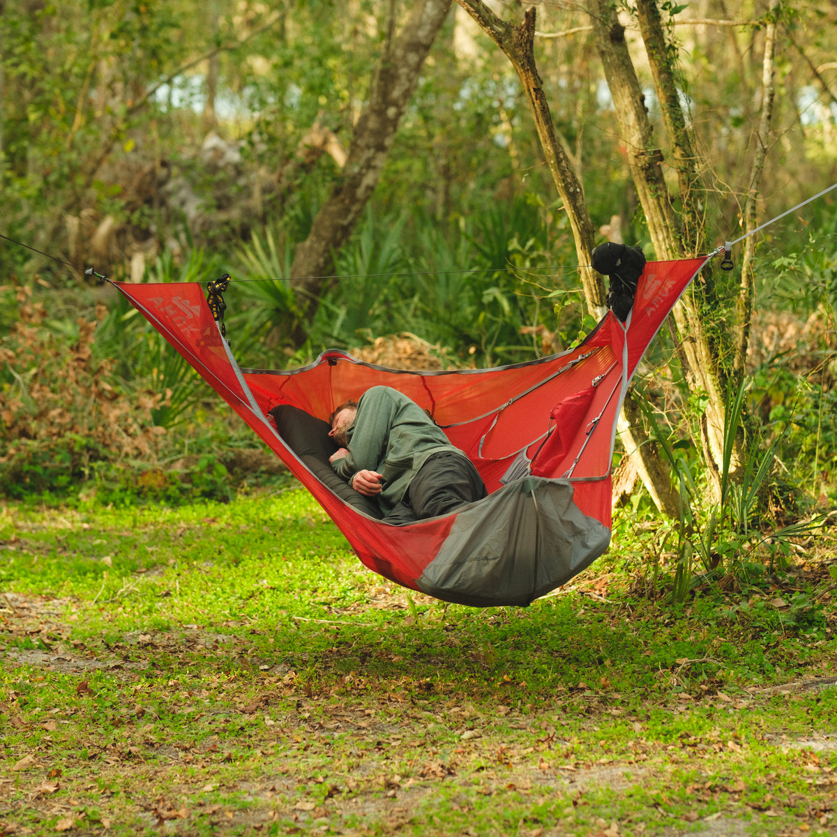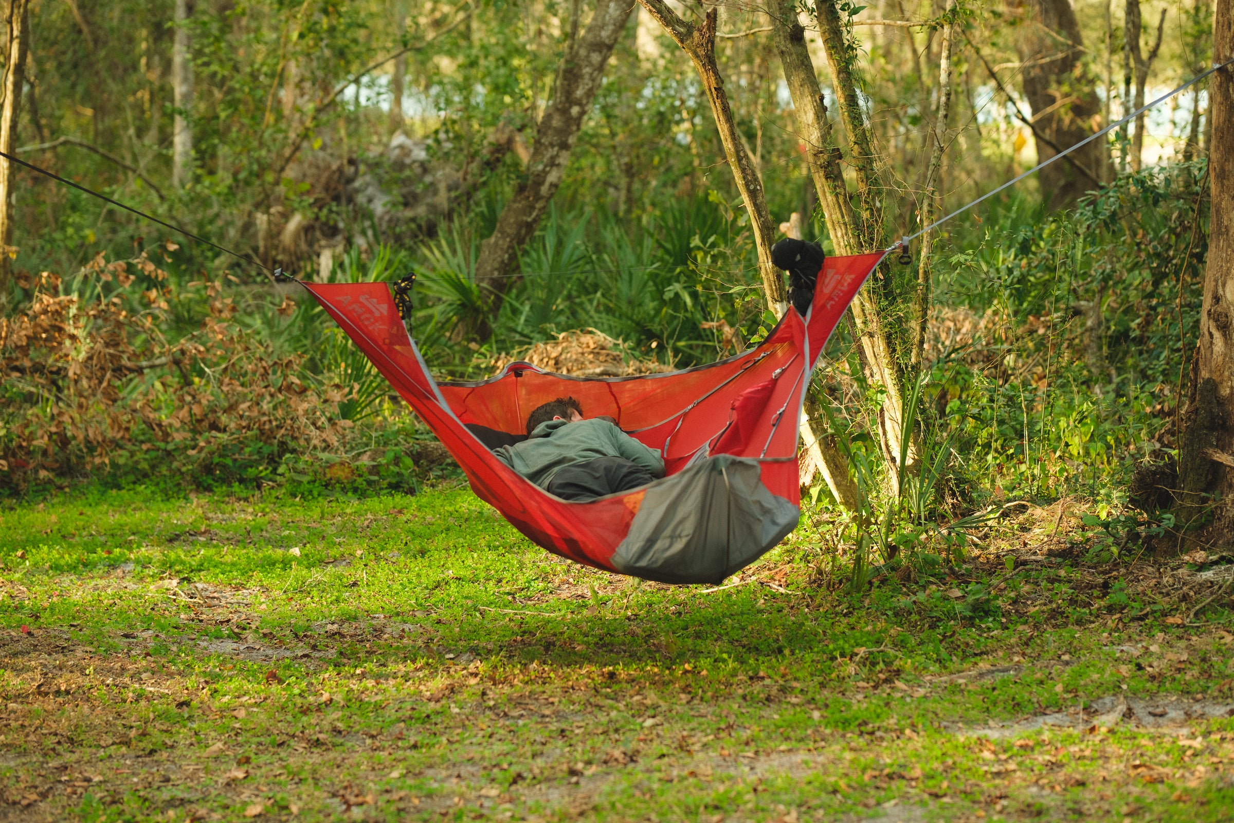 Draumr får en del av sin struktur ved hjelp av et liggeunderlag, som gir en flatere, mer komfortabel og romslig liggeflate enn tradisjonelle hengekøyer. Våre liggeunderlag er godt isolerte og 9 cm tykke. Du holder deg god og varm, samtidig som køya og liggeunderlaget former seg etter kroppen - som en overmadrass!